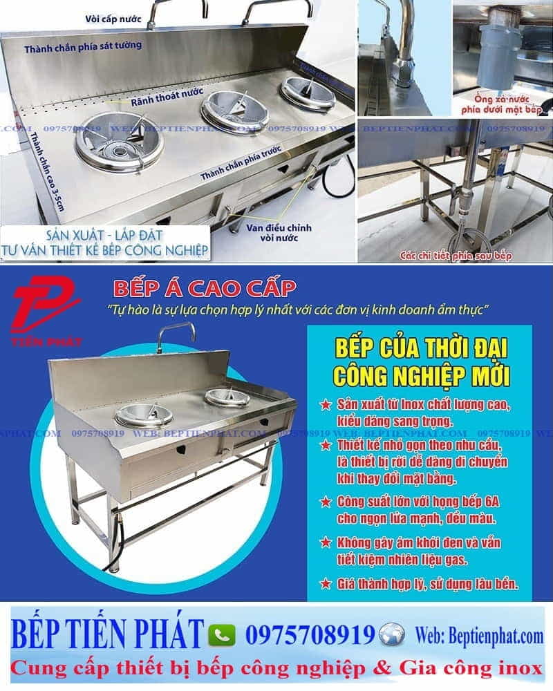 Để được tư vấn, thiết kế, lắp đặt các loại bếp Á công nghiệp, bếp công nghiệp inox, bếp gas công nghiệp 1 họng đốt, 2 họng đốt, 3 họng đốt với mọi kích thước và nhu cầu sử dụng khác nhau, hãy liên hệ ngay với Bếp Tiến Phát. Hotline: 0975708919