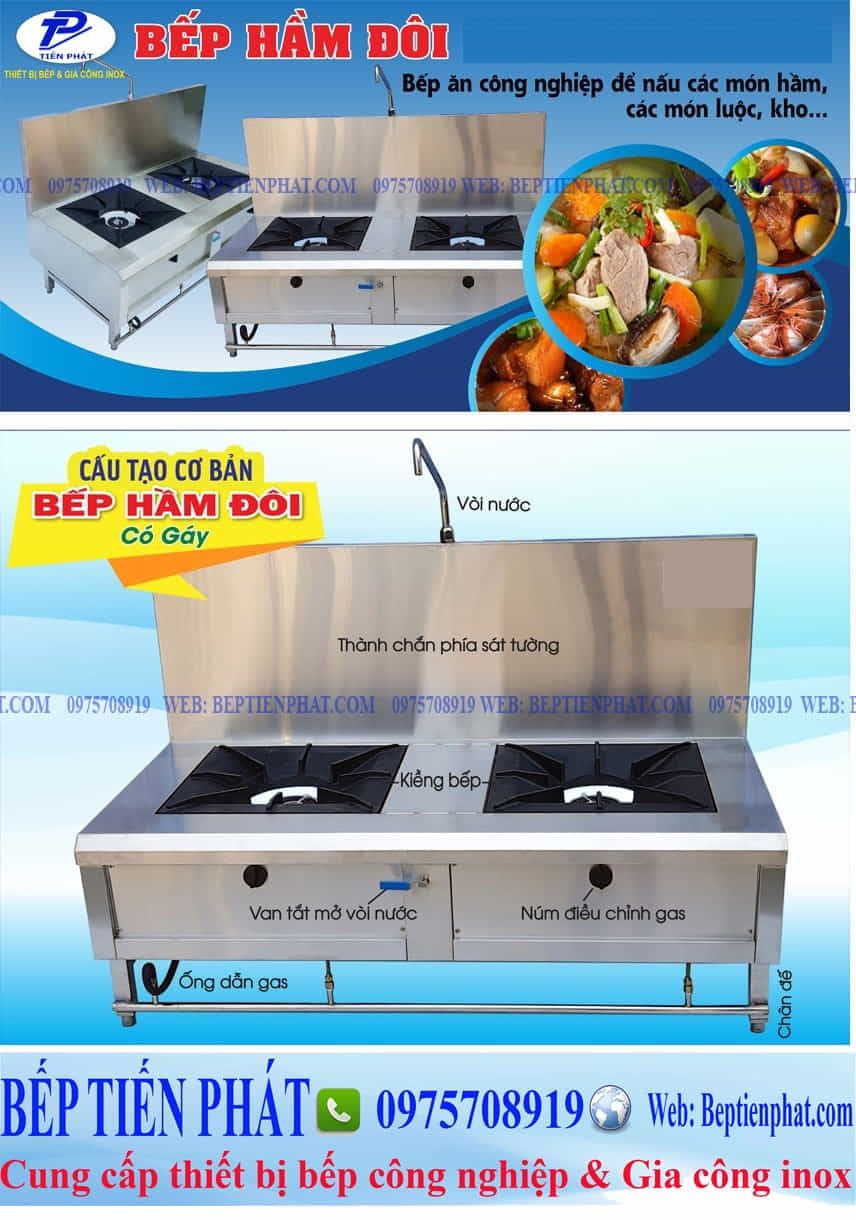 Bếp hầm công nghiệp: Sản phẩm bếp công nghiệp được Bếp Tiến Phát cung ứng như: bếp 4 họng, bếp 6 họng, lò nướng, bếp kết hợp lò nướng, bếp nướng than, chậu rửa bát, tủ hấp cơm công nghiệp, thùng đá inox quầy bar, xe đẩy dụng cụ y tế, kệ inox, bếp á hầm đơn đôi, bếp chiên phẳng, bể tách mỡ, tủ hâm nóng thức ăn, xe đẩy nhiều khay, chụp hút khói, ống tiêu âm, tủ đông 2 cánh... sẽ làm hài lòng cả những khách hàng khó tính nhất. Các thiết bị bếp công nghiệp của Bếp Tiến Phát được thiết kế hết sức thông minh, giúp tiết kiệm thời gian nấu nướng và tối ưu hóa mục đích sử dụng.