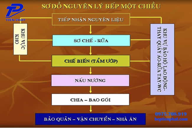 Theo Bếp Tiến Phát nguyên tắc quan trọng nhất trong việc thiết kế bếp ăn công nghiệp cơ bản là thiết kế theo quy trình bếp một chiều. Thiết kế này giúp đảm bảo sự lưu thông một chiều của thực phẩm, tránh sự chồng chéo trong các khâu nấu nướng, tiết kiệm tối đa thời gian, đồng thời tránh sự va chạm giữa các thực phẩm sống chín đảm bảo an toàn vệ sinh thực phẩm.